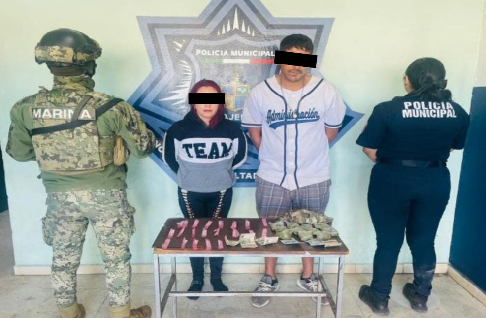 Aprehendiendo a Viridiana “N.”, de 34 años y José Dolores “N.”, de 37 años, a quienes tras una inspección física se le localizó entre sus vestimentas 20 envoltorios con una sustancia granulada similar a las de un narcótico y 11 dosis de una hierba verde y seca como la marihuana.
