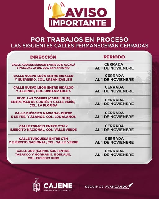 Atención a la ciudadanía. Continúan los trabajos de rehabilitación en las siguientes calles. Lamentamos los inconvenientes, agradecemos su comprensión y cooperación. Por el bienestar de Cajeme #SeguimosAvanzando