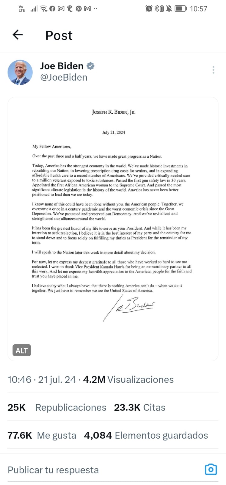 Así lo dio a conocer el propio mandatario en una carta abierta publicada en su perfil de X, donde redactó “ha sido el mayor honor de mi vida servir como su presidente, y aunque mi intención era competir por la reelección creo que lo mejor para los intereses de mi partido y mi nación es dar un paso a un lado”.