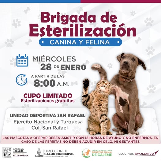 Este miércoles 28 de enero se llevará a cabo la brigada de esterilización gratuita para perros y gatos, como una acción responsable para el cuidado animal y la salud pública.
