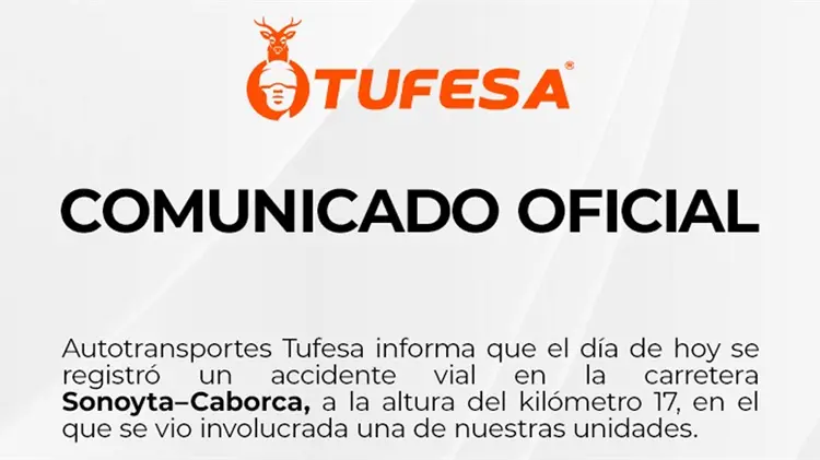 La empresa Autotransportes Tufesa emitió un pronunciamiento oficial tras el accidente vial registrado este viernes en la carretera Sonoyta-Caborca. El incidente ocurrió específicamente a la altura del kilómetro 17, involucrando a una unidad perteneciente a su flota de transporte de pasajeros.