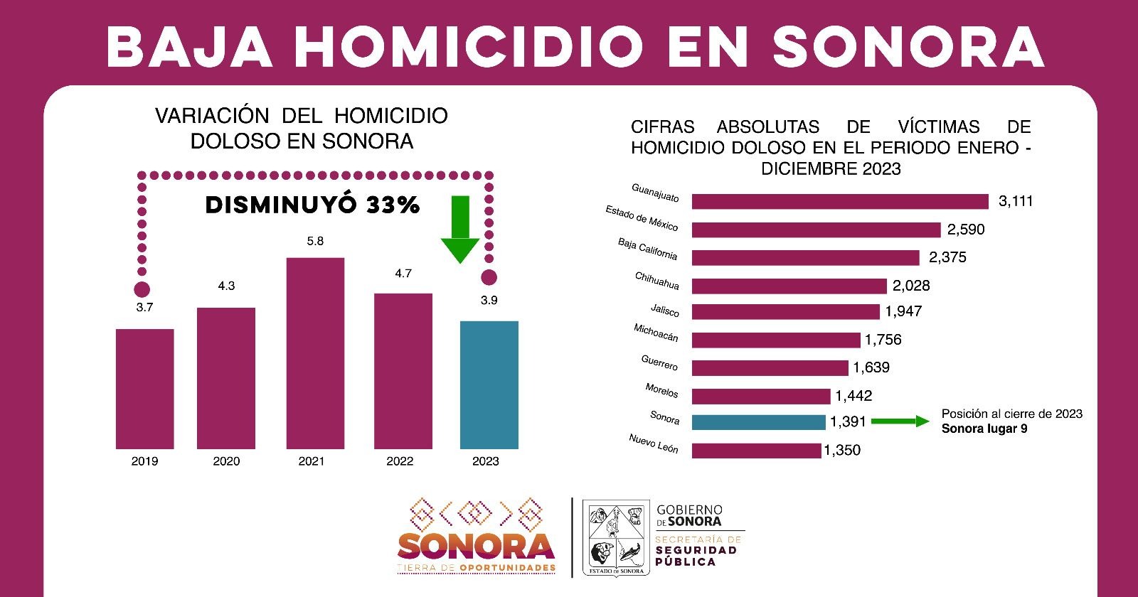 Esto ha logrado que, desde el mismo periodo, Sonora haya bajado del cuarto lugar al noveno a nivel nacional, rompiendo la tendencia a la alza que se tenía al inicio de la actual administración.