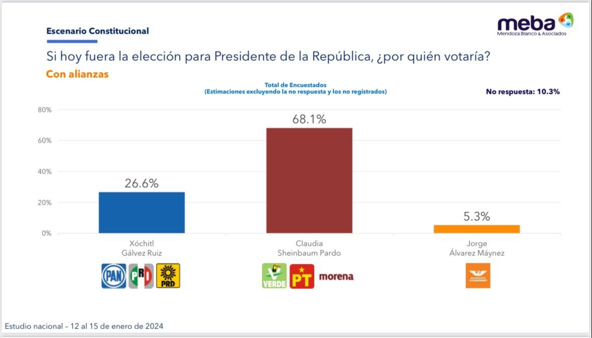 La casa encuestadora publicó su más reciente Estudio Nacional de Clima Político este miércoles 24 de enero, donde destaca que la candidata de Morena, PT y PVEM tiene una ventaja del 61.8 por ciento de intención de voto, en comparación con el 31.7 por ciento de la candidata de PAN-PRI-PRD, y 6.5 por ciento de Jorge Álvarez Máynez, de Movimiento Ciudadano.