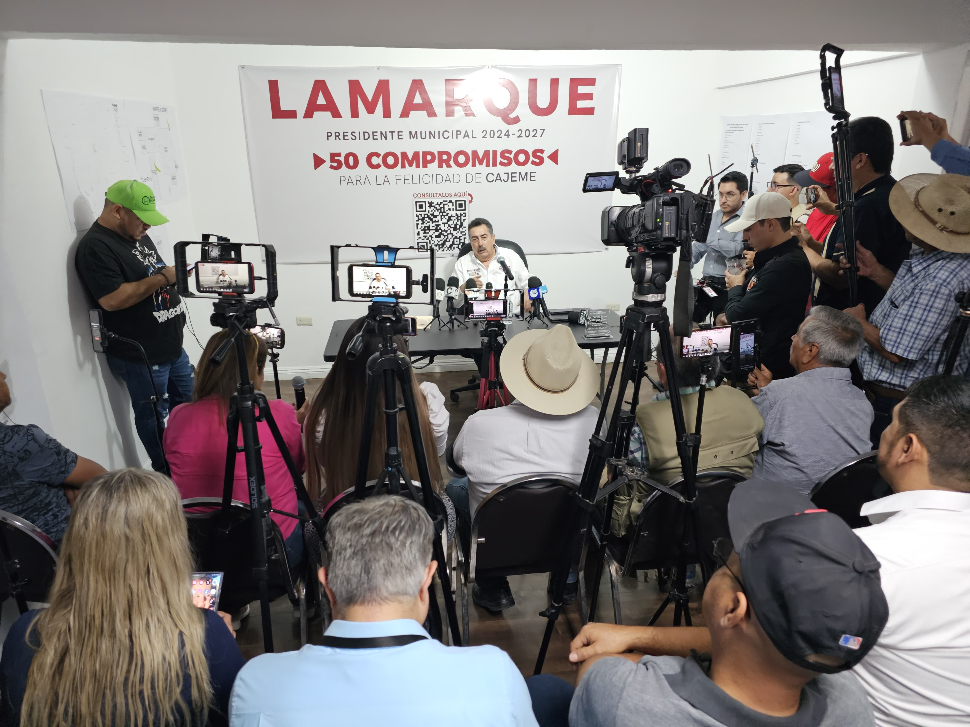 Durante la rueda de prensa encabezada por Javier Lamarque Cano, candidato a la Presidencia Municipal de Cajeme por la Coalición Sigamos Haciendo Historia, abordó distintos temas ante los medios de comunicación.