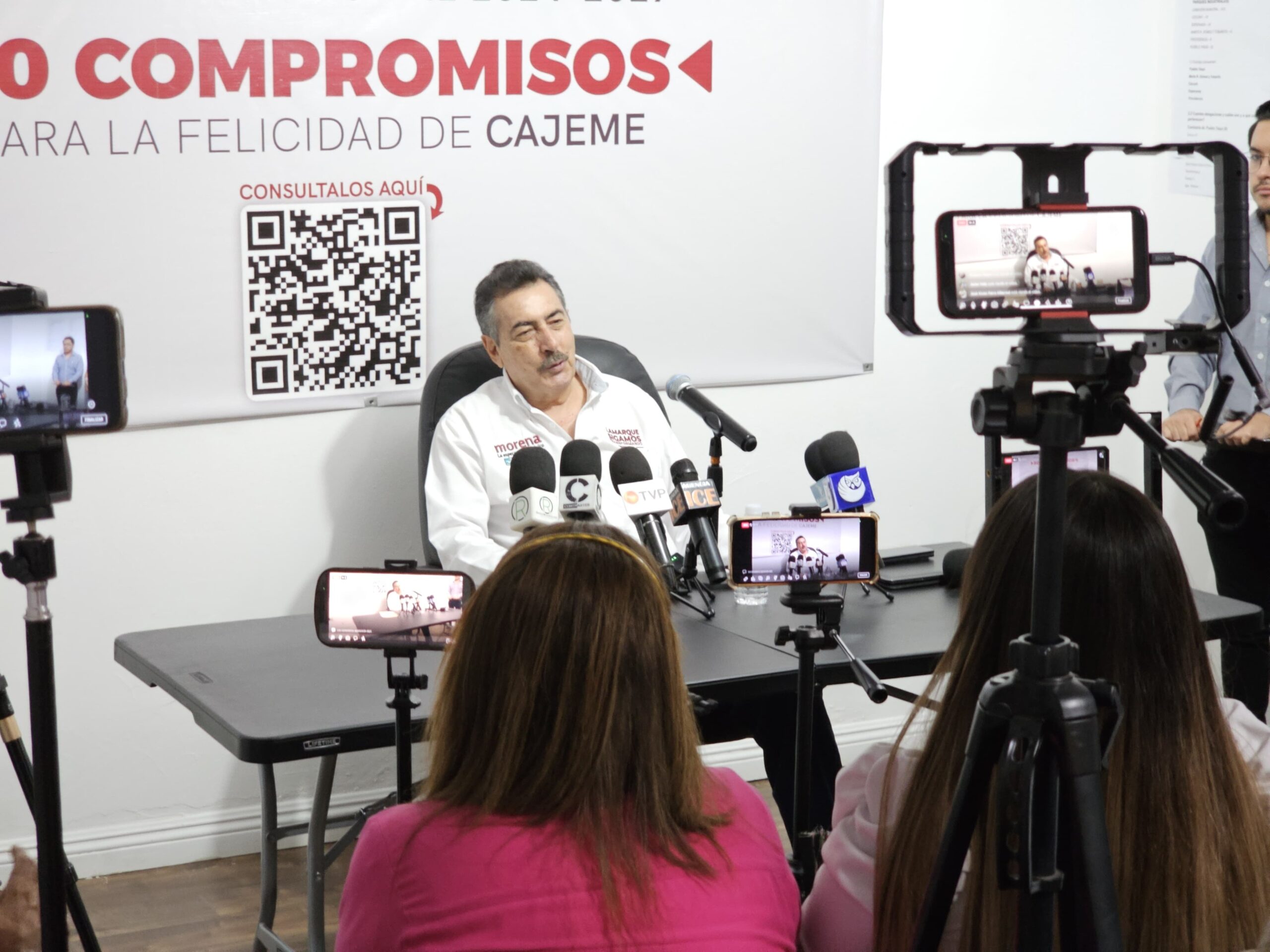 Durante la rueda de prensa encabezada por Javier Lamarque Cano, candidato a la Presidencia Municipal de Cajeme por la Coalición Sigamos Haciendo Historia, abordó distintos temas ante los medios de comunicación.