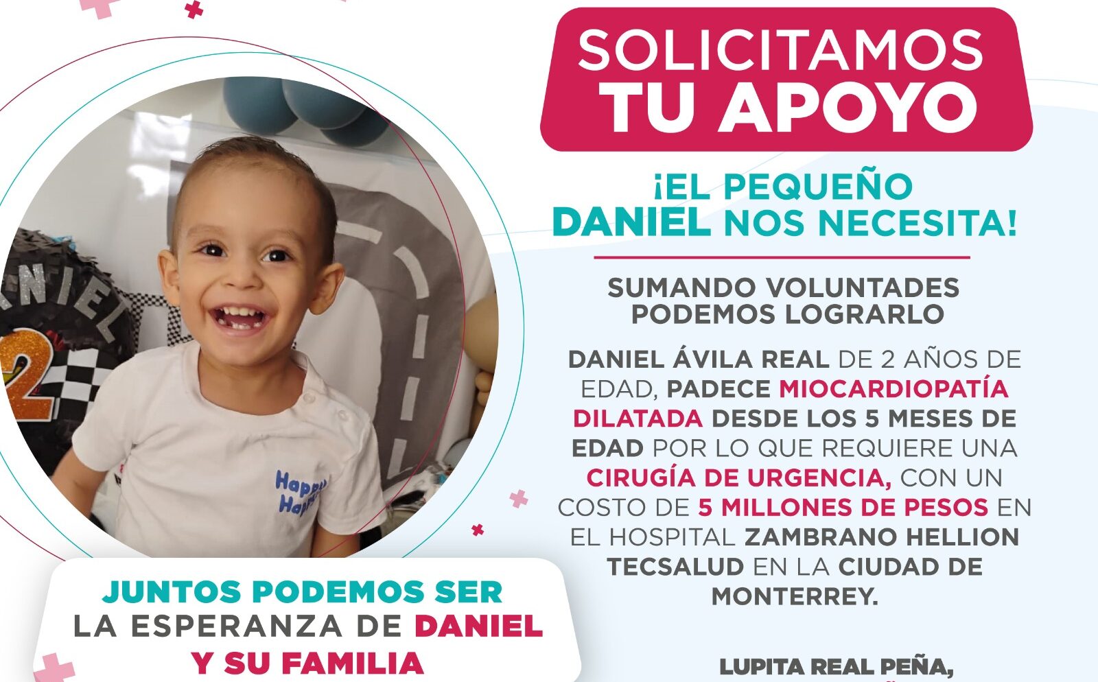 El pequeño Daniel,de 2 años de edad, requiere una importante cirugía del corazón; él, junto a su familia, originarios de Ciudad Obregón, necesitan reunir la cantidad de 5 millones de pesos para realizar la cirugía, sin embargo dicho procedimiento se realiza en una clínica privada en Monterrey, Nuevo León, por lo que además requieren apoyo económico para vivienda, alimentación, medicamento y traslados.
