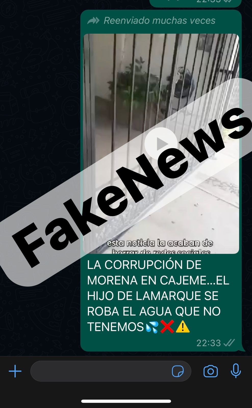 “Les informamos que el video que circula en redes sociales contiene información errónea, ya que se trata de una fuga de agua que ya fue atendida en su momento, el lugar mencionado en el video tiene todos sus documentos en regla y pagos al día. “No es más que una campaña negra de la oposición para desprestigiar al candidato”. Informan