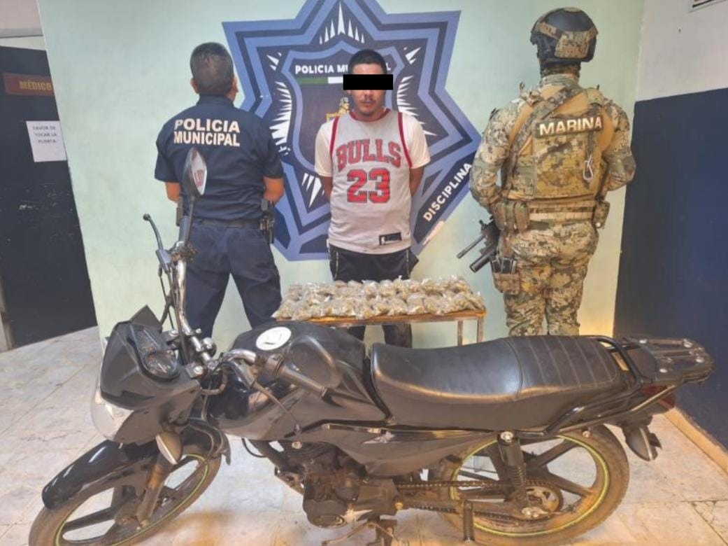 Un total de 60 bolsas de plástico que en su interior contenían una hierba seca y de color verde, fue el resultado de la detención por parte de agentes de la Policía Municipal y Marina, de un motociclista que circulaba a exceso de velocidad y sin casco.