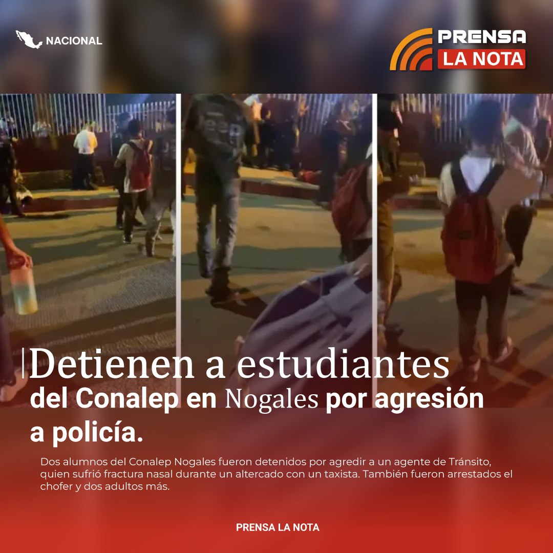 Dos alumnos del Conalep en Nogales fueron detenidos tras agredir a un agente de Tránsito Municipal durante un altercado con un taxista. El policía resultó con fractura en el tabique nasal. Los menores quedaron bajo custodia tutelar mientras continúa la investigación.