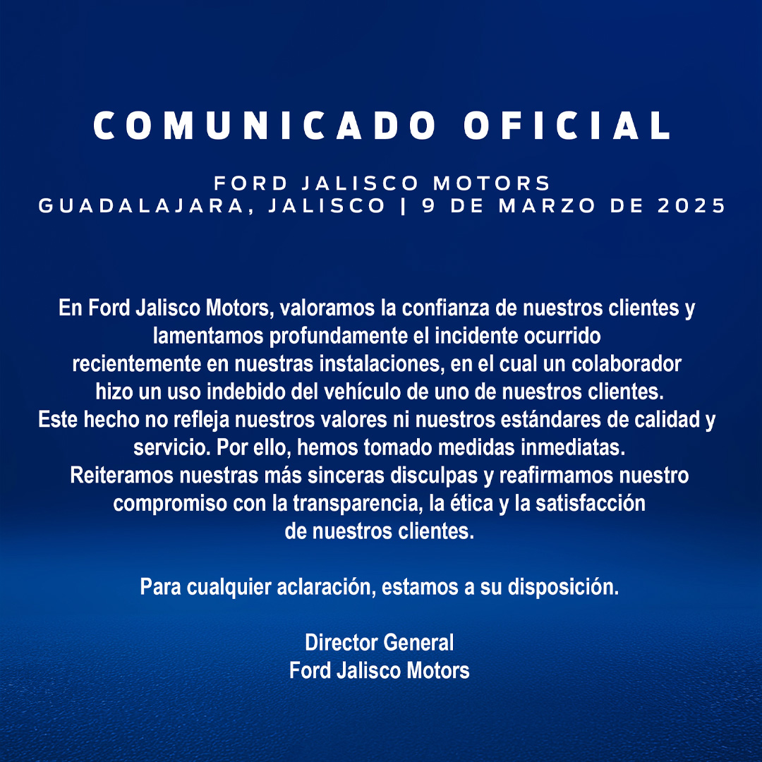 “Hemos buscado exhaustivamente al cliente para ofrecer la reparación del daño, esperaremos su contacto de vuelta. En Ford Jalisco Motors, valoramos la confianza de nuestros clientes y lamentamos profundamente el incidente ocurrido recientemente en nuestras instalaciones. Este hecho no refleja nuestros valores ni nuestros estándares de calidad y servicio. Por ello, hemos tomado medidas inmediatas”.