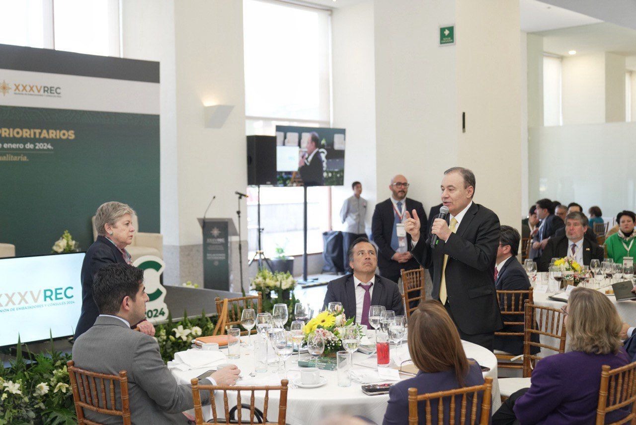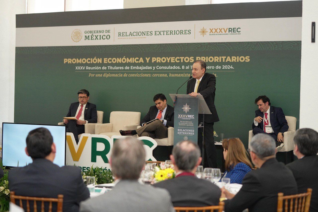 Ante el cuerpo diplomático mexicano, el mandatario estatal resaltó las vertientes del Plan Sonora, con la generación de energía fotovoltaica, el aprovechamiento del litio con la cadena de electromovilidad, la licuefacción de gas natural, la preparación del capital humano, y la modernización del puerto de Guaymas.