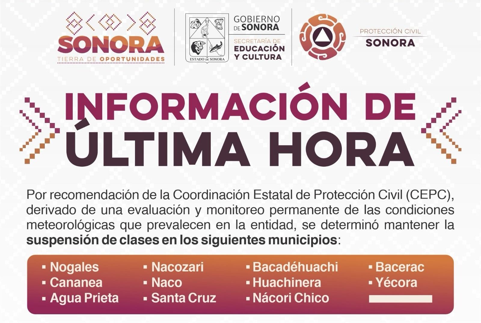 Hermosillo, Sonora; 8 de enero de 2024.- Por recomendación de la Coordinación Estatal de Protección Civil (CEPC), derivado de una evaluación y monitoreo permanente de las condiciones meteorológicas que prevalecen en la entidad, se determinó mantener la suspensión de clases en Nogales, Cananea, Agua Prieta, Nacozari, Naco, Santa Cruz, Bacadéhuachi, Huachinera, Nácori Chico, Bacerac y Yécora.