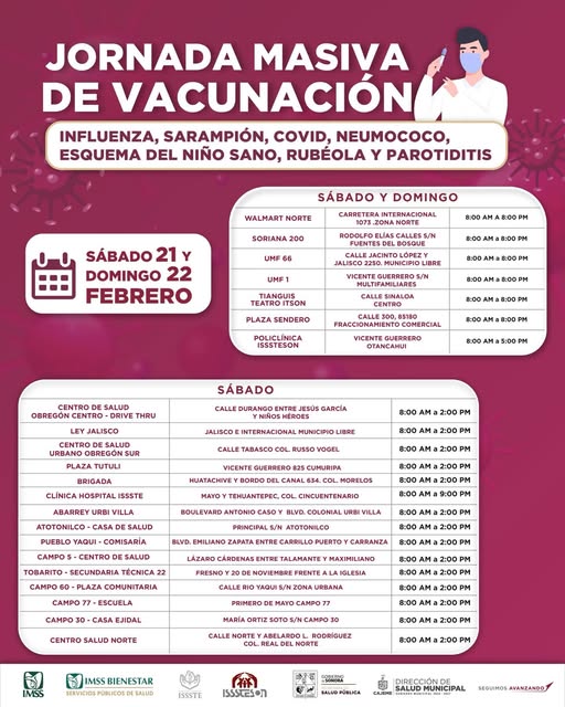 El Municipio de Cajeme invita a toda la comunidad a completar sus esquemas de vacunación este 21 y 22 de febrero. Contaremos con dosis contra Sarampión, Influenza, COVID, Neumococo y esquema del niño sano.