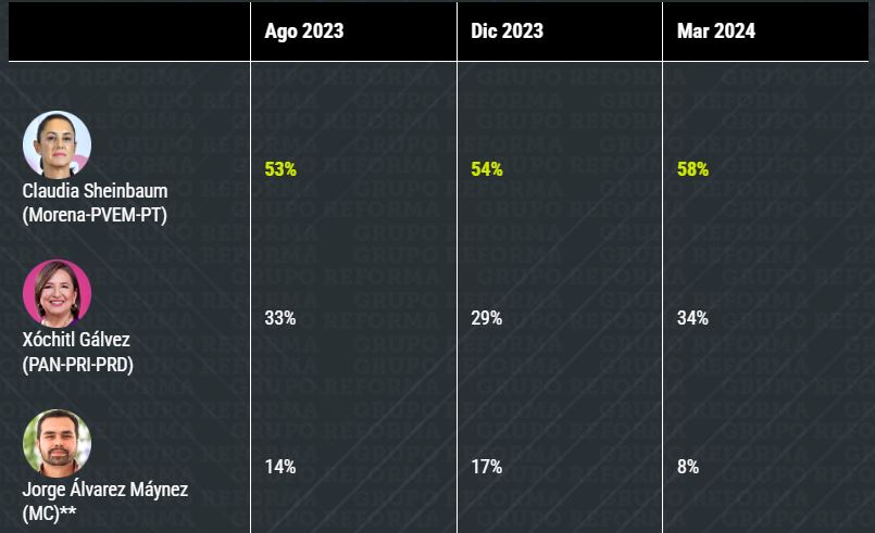 La encuesta de Grupo REFORMA sobre preferencias electorales da una ventaja de 24 puntos a Claudia Sheinbaum sobre Xóchitl Gálvez rumbo a una elección en la que prácticamente la mitad de los encuestados ya decidió su voto para el 2 de junio, según el estudio.