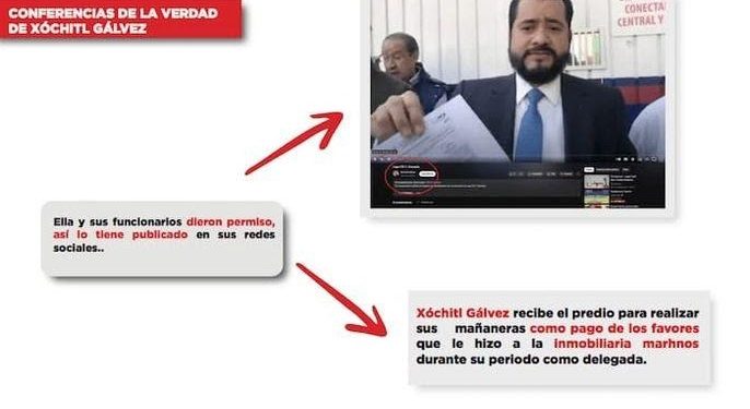 “¿Qué estamos denunciando? Que ella [Gálvez] es socia y parte del grupo Marhnos, porque le da las licencias y contratos: conflicto de interés, tráfico de influencias, corrupción. Es la nueva modalidad del moche. Ya no es la lana literal, ya es ‘te entrego contratos o te hago el favor de pagar tu viaje a España y organizarte la agenda. Y aparte te presto mi casa, te presto mi edificio, y ahí da las conferencias de prensa’. No sabemos qué otros favores y cuánto dinero esta desarrolladora inmobiliaria le está entregando a la campaña de Xóchitl Gálvez para financiar los Xochibots. El dueño, Nicolás Mariscal, acompañó a la candidata en su reciente visita a España; gira que financió y cuya agenda organizó”, acusó.