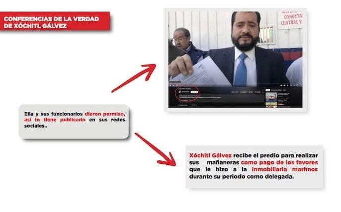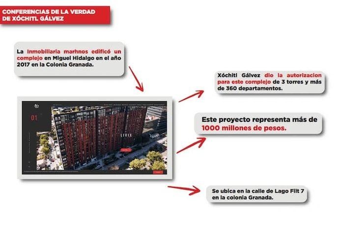 En su intervención, Víctor Hugo Romo explicó que, en 2017, la empresa Marhnos edificó un complejo inmobiliario de casi mil millones de pesos en la alcaldía Miguel Hidalgo, para el cual la entonces delegada Xóchitl Gálvez le otorgó las licencias y los contratos. “Ella [Gálvez] da los permisos, ella da las licencias, ella da las manifestaciones de construcción, ella genera la publicitación vecinal, se hace el desarrollo inmobiliario en su periodo, sí, y es de tres torres: 360 departamentos, un complejo de casi mil millones de pesos”.