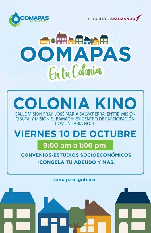 Este VIERNES 10 de OCTUBRE, estaremos en COLONIA KINO con nuestro módulo móvil para pago de recibo de agua, aclaraciones y convenios de pago.