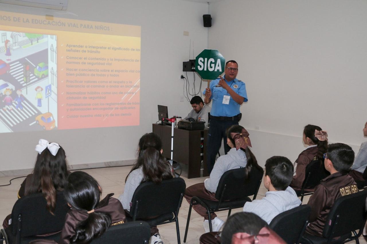 Para promover la semilla de la cultura vial en las y los niños del municipio de Cajeme, agentes de Tránsito de la Secretaría de Seguridad Pública Municipal, trabajan en la impartición de pláticas en el sector educativo.
