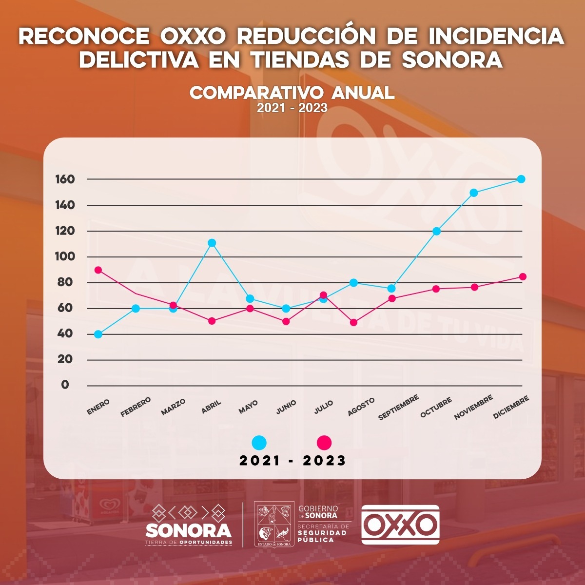 Hermosillo, Sonora, 27 de enero de 2024.- Representantes de la cadena comercial OXXO compartieron a la Secretaría de Seguridad Pública (SSP) informe estadístico en el que destaca la disminución del 27 por ciento en el delito de robo con violencia en tiendas de Sonora informó, María Dolores del Río.