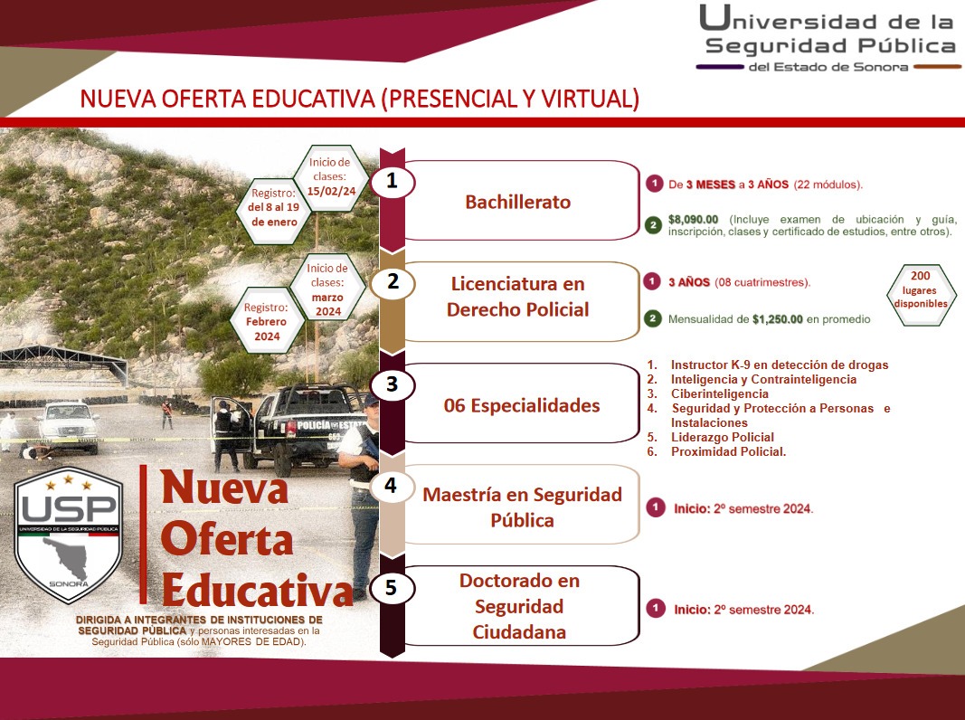 El titular de la Universidad compartió que, el Bachillerato es otra de las ofertas educativas dirigidas a personal en activo que se desarrolle o tenga intención en el ámbito de la seguridad pública. Esta modalidad, dijo, iniciará clases el 15 de febrero.